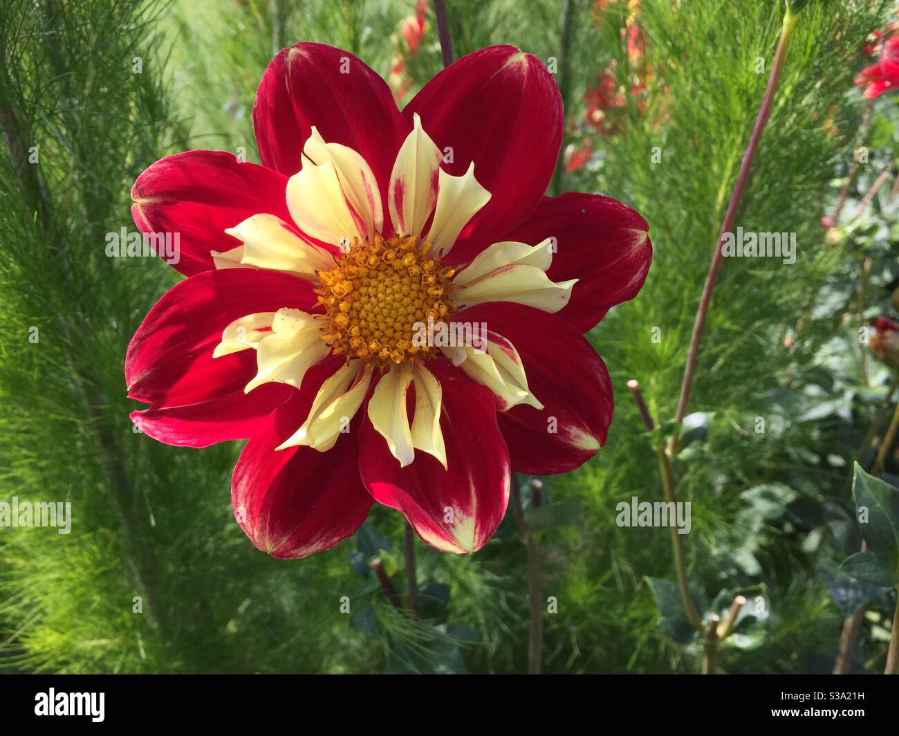 Collerette Dahlia Michael Rosch Red Outer Ring With Soft Yellow Inner Ring Or Colletette Halskrausendahlie Rot Und Gelb Stock Photo Alamy